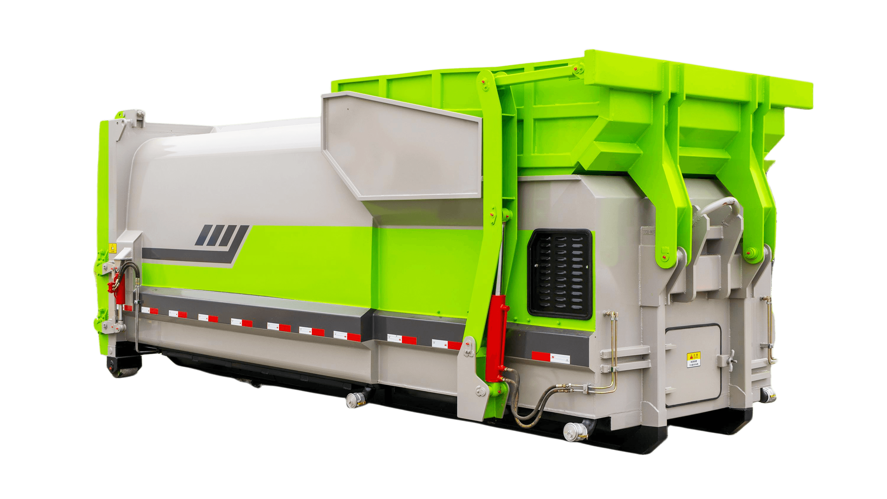 景觀式智能移動壓縮轉(zhuǎn)運站設備,由壓縮腔、壓縮頭、滑蓋油缸、滑蓋,進料口,壓縮垃圾存儲部分、后門總成及鎖緊密封系統(tǒng)、液壓系統(tǒng)、電器控制系統(tǒng)和操控裝置組成,配套拉臂車可根據(jù)需要隨時移動。